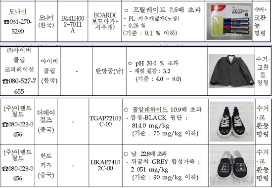 학용품에서는 프탈레이트가소제(2~385배), 납(1.5~66배), 카드뮴(8.5~12배) 기준치를 초과했다. 운동화에서도 폼알데하이드(2.7~10.9배), 납(22.8배) 등이 기준치를 웃돌았다.