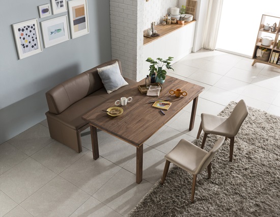 원목 식탁은 고급 수종인 아메리칸 월넛을 사용하여 따뜻하고 내추럴한 분위기를 연출할 수 있으며, 다이닝 소파 벤치는 슬림한 디자인에 소파의 구조가 압축되어 편안한 착석감을 구현한 것이 특징이다. 소파 벤치와 의자는 모두 천연 가죽으로 마감하여 부드러운 촉감을 제공한다.