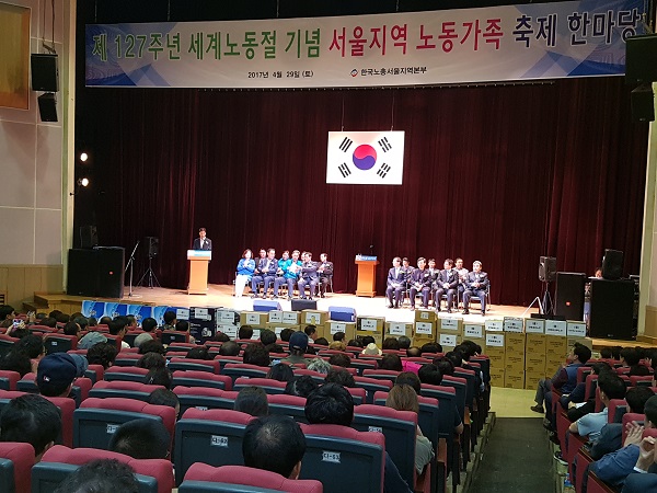 29일 오후 2시부터 오후 6시까지 열린 한국노총 서울지역본부(의장 서종수) 제217주년 세계노동절 기념행사 및 서울지역 노동가족 축제한마당에 박원순 서울시장, 김주영 한국노총위원장, 장신철 서울지방고용노동청장, 이수진 민주당 노동위원회 공동위원장, 허권 금융노조위원장 등 주요 인사들과 조합원 및 가족 등 800여명이 참석했다.