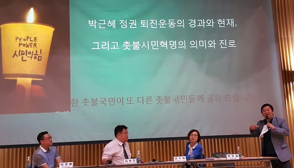 이날 안진걸 참여연대 공동사무처장은 ‘박근혜 정권 퇴진운동의 경과와 현재 그리고 촛불시민혁명의 의미와 진로’에 대해 설명했다.
