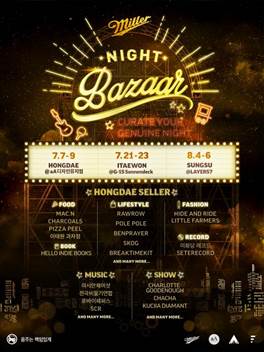 밀러 나이트 바자는 7월 7일~9일 홍대 aA뮤지엄, 7월 21일~23일 이태원 G-15 소넨덱, 8월 4일~6일 성수동 레이어57에서 운영하며 3주 간 각 3일씩 진행되는 대규모 행사가 될 예정이다.