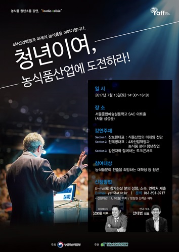 이번 강연은 농식품 산업계에서도 4차 산업혁명이 화두로 떠오르고 있는 가운데 현재 약 160조원에 달하는 식품산업 시장에 예비창업가와 청년들의 도전을 유도하기 위해 마련했다.