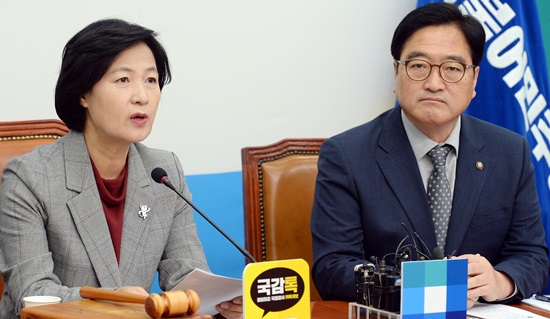 [뉴스엔뷰] 29일 국회에서 열린 더불어민주당 최고위원회의에서 추미애 더불어민주당 대표와 우원식 원내대표는 이명박 전 대통령에 대해 "적반하장"이라고 비난했다.