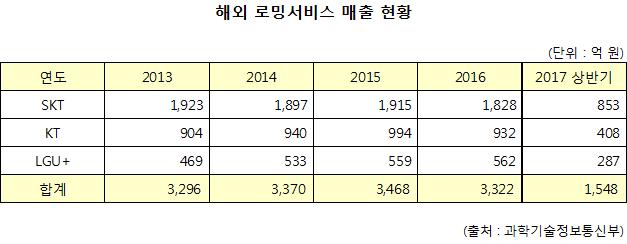 국회 과학기술정보방송통신위원회 소속 국민의당 최명길 의원이 과학기술정보통신부로부터 제출받은 자료에 따르면 지난해 휴대폰 해외 로밍서비스 이용 건수는 1371만건이고 매출액은 3322억원이었다.