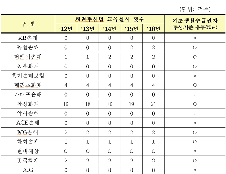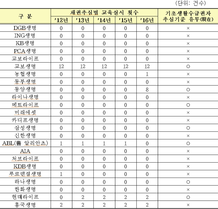 제 의원은 18곳의 생명보험사와 8곳의 손해보험사들이 지난 5년간 '채권추심법'교육을 단 한번도 실시하지 않았다고 밝혔다. 또 각각 7곳, 8곳이 기초생활수급자 추심기준을 보유할 뿐 나머지는 해당기준이 없다고 말했다.
