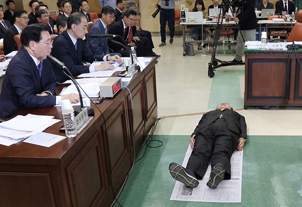 그는 "서울구치소 제소자 1인당 수용면적은 1.06㎡라며 "알기 쉽게 계산을 해보면 신문 2장 반이다. 제가 한번 누워보겠다"고 말하며 직접 제작한 신문지 모형 위에 누웠다.