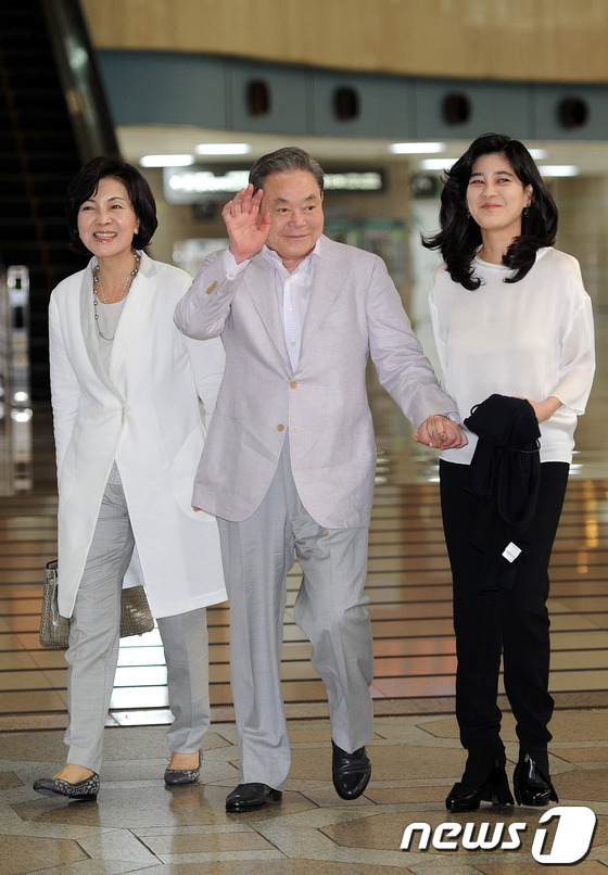 이건희 회장은 이날 오전 9시58분경 부인 홍라희 여사, 장녀 이부진 호텔신라 사장 등과 함께 김포공항에 도착해 손을 흔들어 보이며 곧바로 전용기로 향했다.