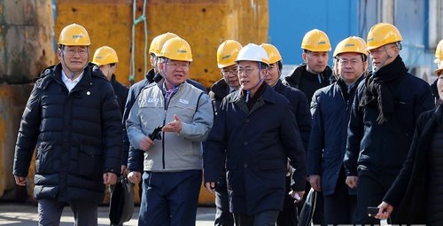문 대통령은 이날 경남 거제시 대우조선해양 옥포조선소의 쇄빙 액화천연가스(LNG) 운반선 건조 현장을 방문했다.