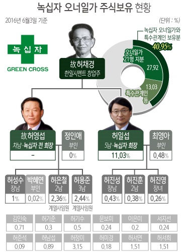 허 회장은 2013년까지는 등기임원이었으나 이후 미등기임원으로 바뀌었다. 당시 허 회장의 연봉이 공개됐는데, 그의 한 해 보수는 6억1100만 원이었다. 녹십자의 등기이사가 1인당 평균 2억900만 원을 보수로 챙긴 점을 감안하면 5억 원 이상의 고액연봉자는 허 회장이 유일하다.