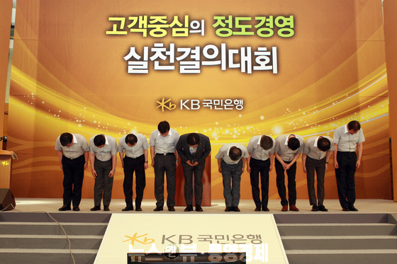[뉴스엔뷰 동양경제] KB국민은행은 1일 민병덕 은행장을 비롯한 경영진과 부점장 1260명 전원이 천안연수원에 모여 고객 중심의 정도경영 실천 선언식을 열었다.