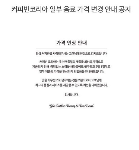 이 날 커피빈코리아 관계자는 "지난 2014년부터 임대료와 원·부자재가 인상돼 메뉴 가격도 오르게 됐다"라고 말했다.