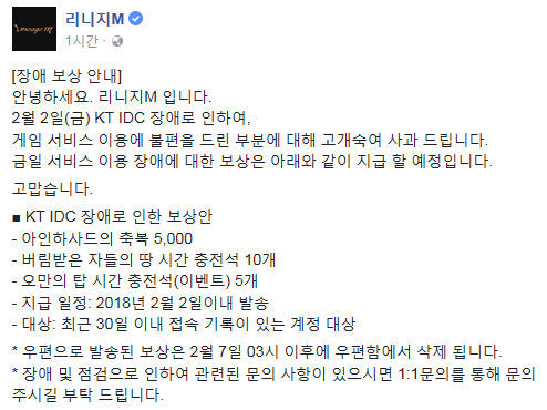 이날 엔씨소프트 관계자는 "KT IDC의 전원 복구 조치 이후 자사의 자체 점검 과정을 거치느라 정상화에 시간이 걸렸다. (오후 5시께) 포털을 제외한 게임서비스는 다 복구됐다"라며 "리니지M의 경우 아이템 아인하사드의 축복 5000개 등을 제공하는 보상안 등을 플레이엔씨에 공지한 상태다"라고 설명했다.