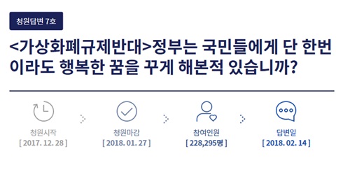 한편 작년 12월, 청와대에 ‘가상통화 투자 규제에 반대한다’고 접수된 국민청원은 지난달 27일까지 28만 건 이상의 동의를 얻었다. 청와대는 20만건을 넘긴 청원에 대해 한 달 이내에 답변한다는 원칙을 갖고 있다.