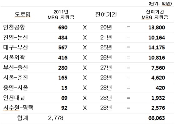 최근 개통한 MRG 민간도로의 운영계약기간이 30년임을 감안하면 향후 20년 동안 정부는 6조6000억원의 예산을 더 투입해야한다.