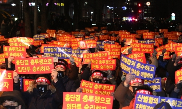 앞서 KB국민은행 노동조합은 지난해 12월 부산을 시작으로 전국에서 총파업 결의대회를 열었다. KB국민은행 노동조합은 지난달 27일 총파업 찬반투표에서 투표자 1만1990명 중 96.01%인 1만1511명이 파업에 찬성했다.