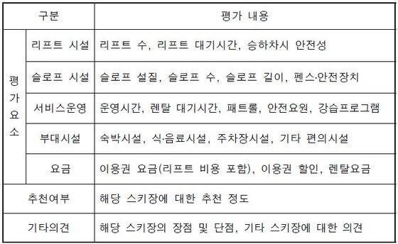 세부 평가 요소는 ▲리프트 시설(리프트 수와 대기시간·승하차시 안전성) ▲슬로프 시설(슬로프 설질· 수·길이와 펜스·안전장치) ▲서비스 운영(운영시간·렌탈 대기시간·패트롤·안전요원·강습프로그램) ▲부대시설(숙박시설과 식음료시설·주차장시설등) ▲요금(이용권 요금 및 할인·렌탈요금) 등 5개 항목이다.