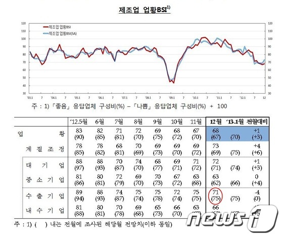 26일 한국은행이 발표한 ‘12월 기업경기실사지수(BSI) 및 경제심리지수(ESI)’에 따르면 제조업 중에서도 수출기업의 12월 업황BSI는 전달보다 4포인트 떨어진 71을 기록했다.