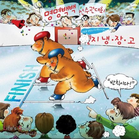 ‘명명백백 선수권대회’ 그림에는 LG전자를 상징하는 빨간색 헬멧을 쓴 곰과 삼성전자를 상징하는 파란색 헬멧을 쓴 곰이 스케이트 경기에서 결승전에 들어오는 모습이 그려져 있다.