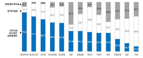설문조사 결과에 따르면, 코로나19 이후 성장세를 묻는 질문에 제약/바이오 산업 종사자의 긍정 응답은 79.2%에 달했다. 다음으로는 ▲통신/미디어 업종(71.1%) ▲반도체(65.1%) ▲인터넷/게임(58.7%)▲공유경제(숙박․모빌리티 등․57.8%) 순이었다. 반면 건설업종의 성장세에 대한 긍정 응답률은 10.3%로 13개 업종 가운데 가장 낮았다. 다음으로 철강 16.7%, 은행/보험 25.3%의 응답률을 기록하면서, 근로자들은 이들 업종이 코로나19 사태 이전과 큰 차이가 없을 것으로 전망했다.