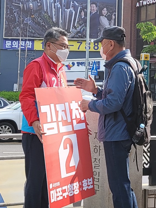 호남향우회 마포구 연합회(조철옥), 마포 농수산물 시장 상인회(정양호), 마포구 가정어린이집 연합회(조영희), 마포구 지역아동센터연합회(조재선), 마포구 소상공인 연합회(박세권), 홍대걷고싶은거리 상인회(박세권), 마포구 요식업회(소영철), 생활체육 마포구 야구연합회(김도연), 사단법인 여성자원금고(김근화), 마포 어르신돌봄통합지원센터(엄영수) 등은 '마포와 마포주민을 사랑하는 김진천 예비후보를 지지한다. 새로운 마포를 위해 노력해주실 김 후보에게 힘을 모아달라'며, '구민들에게 제대로 파고들 수 있는 시간이 얼마 남지 않았다. 국민의힘은 조속히 공천을 마무리해 김 예비후보가 당당하게 선거운동을 할 수 있게 하라'고 전했다.