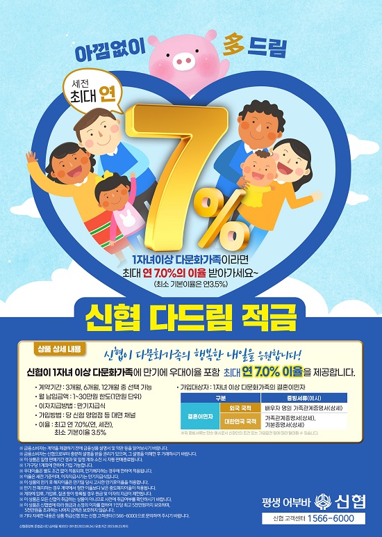 뿐만 아니라 ‘신협 다드림 적금’은 다문화가족의 경제적 자립을 돕기 위한 고금리 적금상품으로 월 30만 원까지 최장 1년 동안 불입이 가능하며, 기본이율 3.5%에 우대이율 3.5%를 적용해 만기 해지 시 최고 연 7%의 금리를 적용받을 수 있다. 단기 저축으로 적금을 이용할 수 있도록 계약기간을 3개월, 6개월, 12개월로 다양하게 한 것도 주목할 점이다. 총 300억 원 한도로 약 9천여 가구가 적금에 가입할 수 있다.