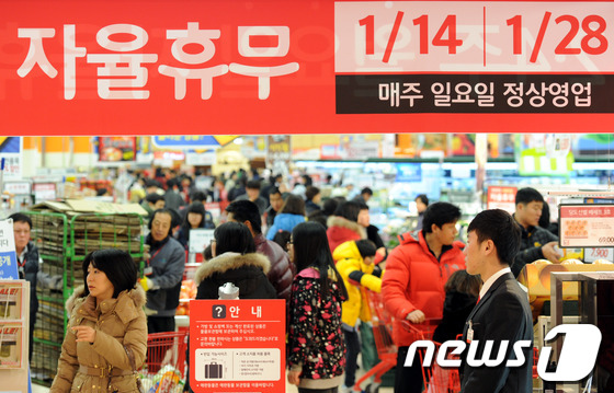 [뉴스엔뷰] 대형마트가 1월 매출 감소로 울쌍이다. 전년보다 늦어진 설 연휴 탓과 함께 대형마트 의무휴무에 따른 영업일 감소 때문에 매출이 20% 이상 하락했기 때문이다.