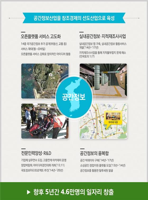 공간정보산업 육성을 통해 국토부는 2017년까지 최소 4만6천여 개의 일자리를 만들기로 했다. 이를 위해 공간 빅데이터 체계 구축에 2천억원, R&D 및 지적재조사 사업에 8천억원을 투입하기로 했다.