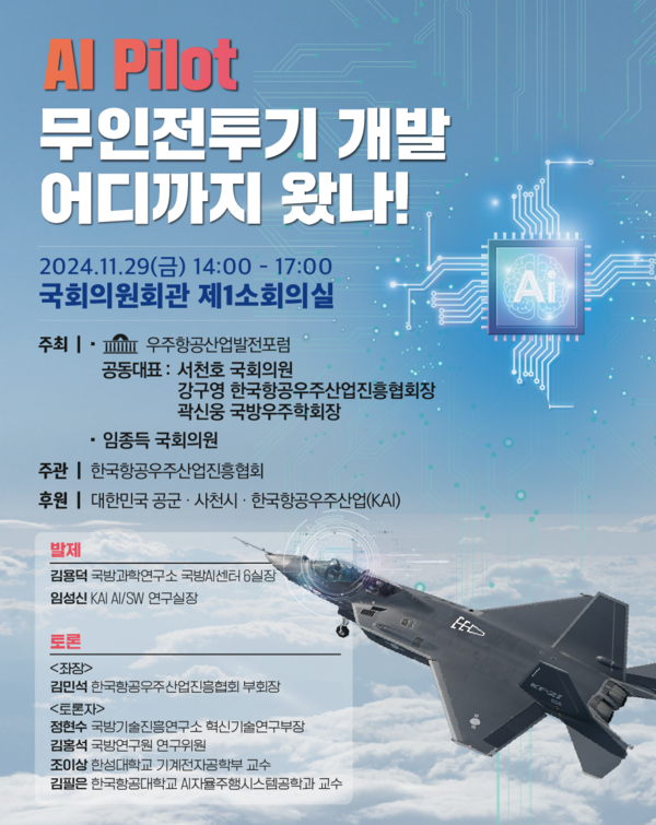 [뉴스엔뷰] 우주강국 기반을 닦기 위한 민관산학이 함께하는 상생협의체인 우주항공산업발전포럼(공동대표 서천호 국회의원, 강구영 한국항공우주산업진흥협회장, 곽신웅 국방우주학회장)과 국회 국방위소속 임종득 국회의원은 오는 29일 국회에서 ‘AI PILOT 무인전투기 개발 어디까지 왔나!’라는 주제로 정책토론회를 개최할 예정이다