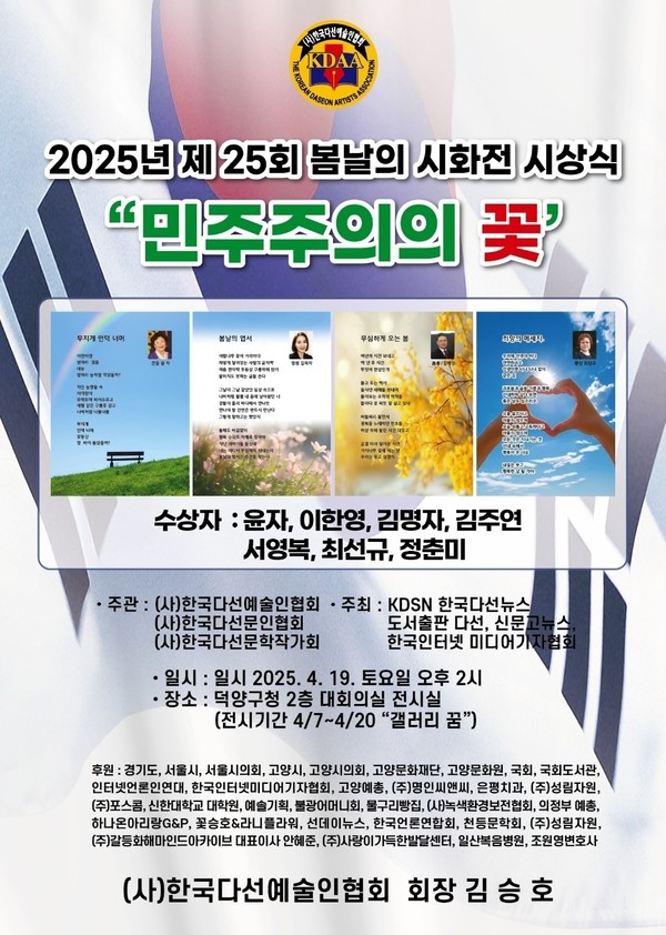 [뉴스엔뷰 고양] (사)한국다선예술인협회 회장 김승호는 4월 20일까지 고양시 덕양구청 2층 전시실 ‘갤러리 꿈’에서 봄날의 시화전 ‘민주주의의 꽃이 피어난다’를 주제로 시화전을 연다.