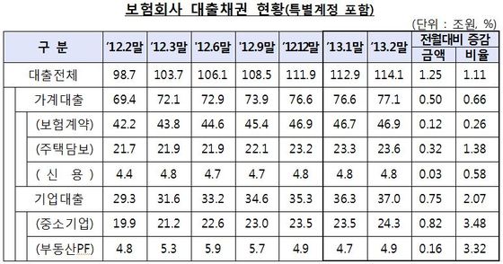 금융감독원에 따르면 2월말 기준 보험사의 대출채권 잔액은 114조1000억원으로, 이중 가계대출과 기업대출은 각각 77조1000억원(67.6%), 37조원(32.4%)으로 나타났다.