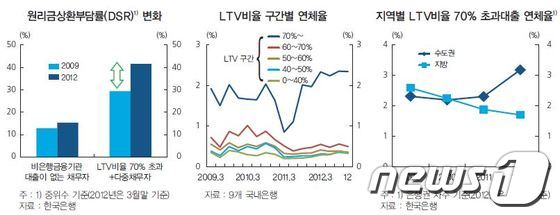 특히 비은행금융기관의 경우 LTV비율 70% 초과 대출 비중(2012년 6월 현재 상호금융 29.1%, 저축은행 43.6%, 여신전문금융회사 68.5%)이 매우 높고 동 대출 중심으로 연체가 발생하는 경향이 있다고 한은은 지적했다.