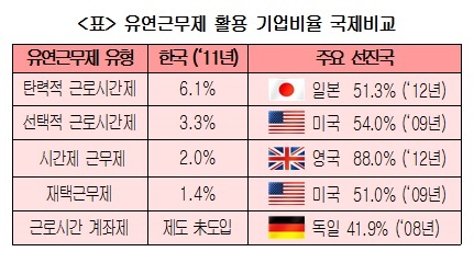 일감이 많을 때 근로시간을 늘리고, 적을 때는 일하는 시간을 줄이는 '탄력적 근로시간제'의 경우 이를 도입한 국내기업은 6.1%인 것으로 조사됐다. 일본, 독일 기업들은 각각 51.3%, 40.0%씩 이 제도를 도입하고 있다.