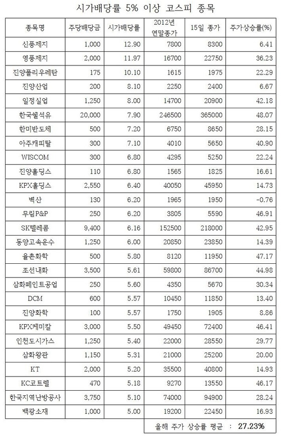 한국상장회사협의회에 따르면 코스피시장의 12월결산 상장법인 중 2012년도에 배당을 실시한 법인은 모두 449개사다. 이 중 27개사가 5%가 넘는 시가배당률을 기록했다.