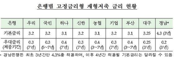 9개 시중은행은 최근 고정금리형 재형저축상품 개발이 마무리가 됐다. 8개 은행은 7년간 금리가 고정되는 ‘7년 고정’ 방식으로, 경남은행은 ‘3년고정+4년고정’ 방식으로 상품을 개발했다.