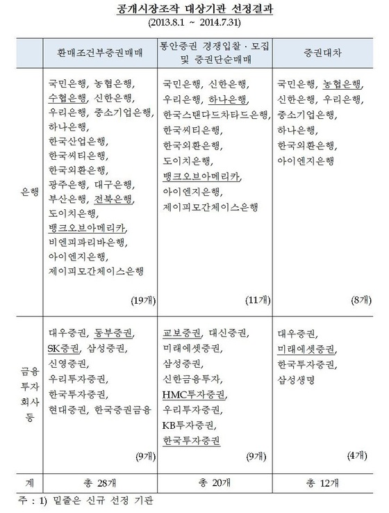 이번 공개시장조작 대상기관의 유효기간은 내달 1일부터 내년 7월31일까지다. 대상기관은 재무건전성 관련 최소요건과 통화안정증권(이하 통안증권) 최소인수비율을 충족하는 기관이다.