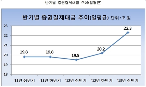 한국예탁결제원은 지난 상반기 예탁원을 통한 증권결제대금은 일평균 22조2930억원으로 2012년 하반기보다 10.5% 증가했다고 25일 밝혔다.