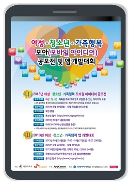 여성가족부(장관 조윤선)는 SK이노베이션(대표이사 구자영)과 19일부터 10월7일까지 ‘여성․청소년․가족 행복 모아(모바일 아이디어) 공모전’을 열기로 했다.