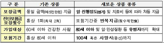 금융감독원에 따르면 최근 보험금(진단비)을 보험기간 중에 반복 지급하거나, 암 진행 정도에 따라 차등지급하는 등 새로운 암보험이 다양하게 출시되고 있어 소비자의 합리적인 선택이 요구된다고 밝혔다.