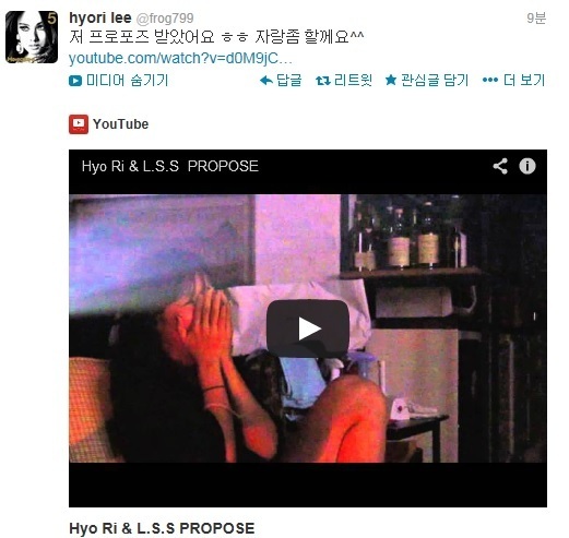 이효리는 자신의 트위터를 통해 “저 프러포즈 받았어요 ㅎㅎ자랑좀 할께요^^”라면서 유투브 영상의 링크를 남겼다.