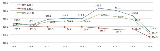 금융감독원에 따르면 올 6월말 기준 전체 보험회사의 RBC는 273.7%로 1분기(307.8%)에 비해 34.1%포인트(P) 떨어졌다고 28일 밝혔다. 생명보험회사의 RBC는 277.7%로 전분기보다 39.8%p, 손해보험회사의 RBC는 264.3%로 20.6%p 하락했다.