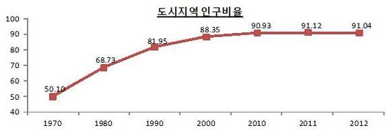 지난해 도시지역 인구는 15만1305명 늘어난 4638만1918명이었으나 상대적으로 비도시지역 인구 증가폭이 커 비율이 감소세를 보였다.
