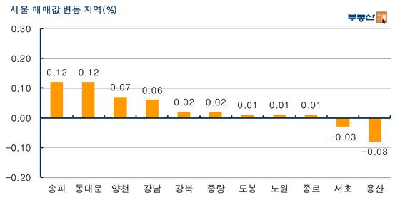 서울은 송파(0.12%), 동대문(0.12%), 양천(0.07%), 강남(0.06%), 강북(0.02%), 중랑(0.02%), 도봉(0.01%), 노원(0.01%), 종로(0.01%)에서 아파트값이 상승했다.