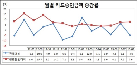 여신금융협회에 따르면 8월 카드승인금액은 총 44조9000억원으로 지난해 같은 기간에 비해 7.6%(3조2000억원) 증가했다. 지난달 7.2%에 이어 두 달 연속 7%대 증가율을 기록했다.