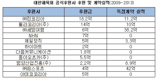 민주당 박홍근 의원은 ‘대한체육회 공식후원사 후원 및 계약내역’을 공개하면서 2009년 이후 대한체육회의 공식후원사로 선정된 후원사들은 현금과 현물로 70억원을 내놓고 대한체육회와 114억원이 넘는 독점 수의계약을 했다고 21일 밝혔다.