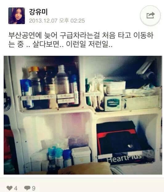 해당 게시물에는 강유미가 7일 자신에 SNS에 “부산공연에 늦어 구급차라는 걸 처음 타고 이동하는 중”이라면서 “살다보면 이런 일, 저런 일…”라며 한장의 사진을 게재했다.
