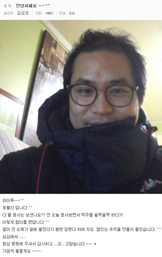 김성균은 “하이루. 포블리 입니다. 다들 응사는 보셨나요?? 전 오늘 응사보면서 맥주를 꼴짝꼴짝 하다가 이렇게 컴터를 켰답니다. 얼마 전 도희가 갤에 들렀다가 봉변 당했다 하여 저도 잼있는 추억을 만들러 들렀습니다. 심심해서… 항상 응원해 주셔서 감사하고… 또… 고맙습니다. 가끔씩 들를게요”라고 언급했다.