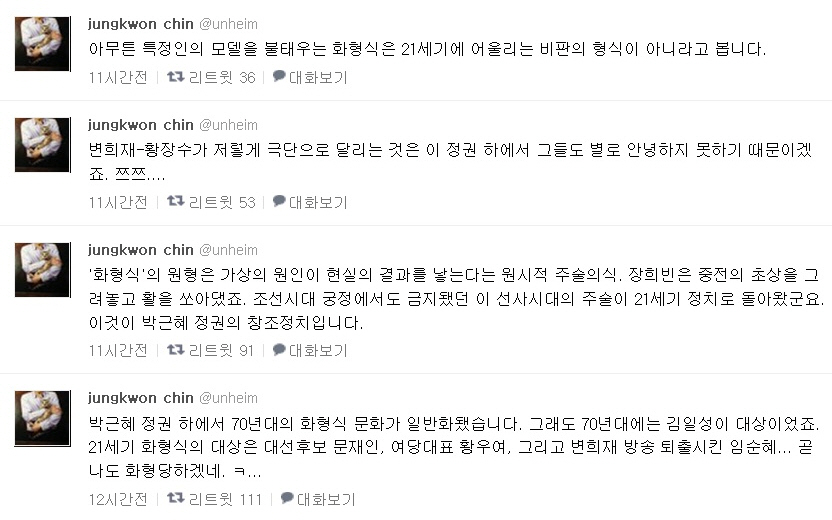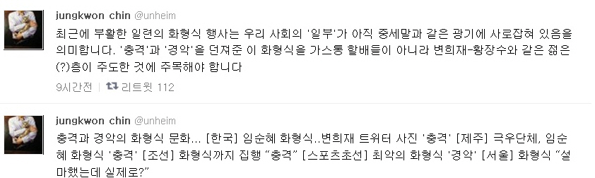 진 교수는 21일 트위터를 통해 “박근혜정권 하에서 70년대의 화형식 문화가 일반화됐다”면서 “그래도 70년대에는 김일성이 대상이었다. 21세기 화형식의 대상은 대선후보 문재인, 여당 대표 황우여, 그리고 변희재 방송 퇴출시킨 임순혜...곧 나도 화형당하겠네”라고 자조섞인 트윗을 날렸다.