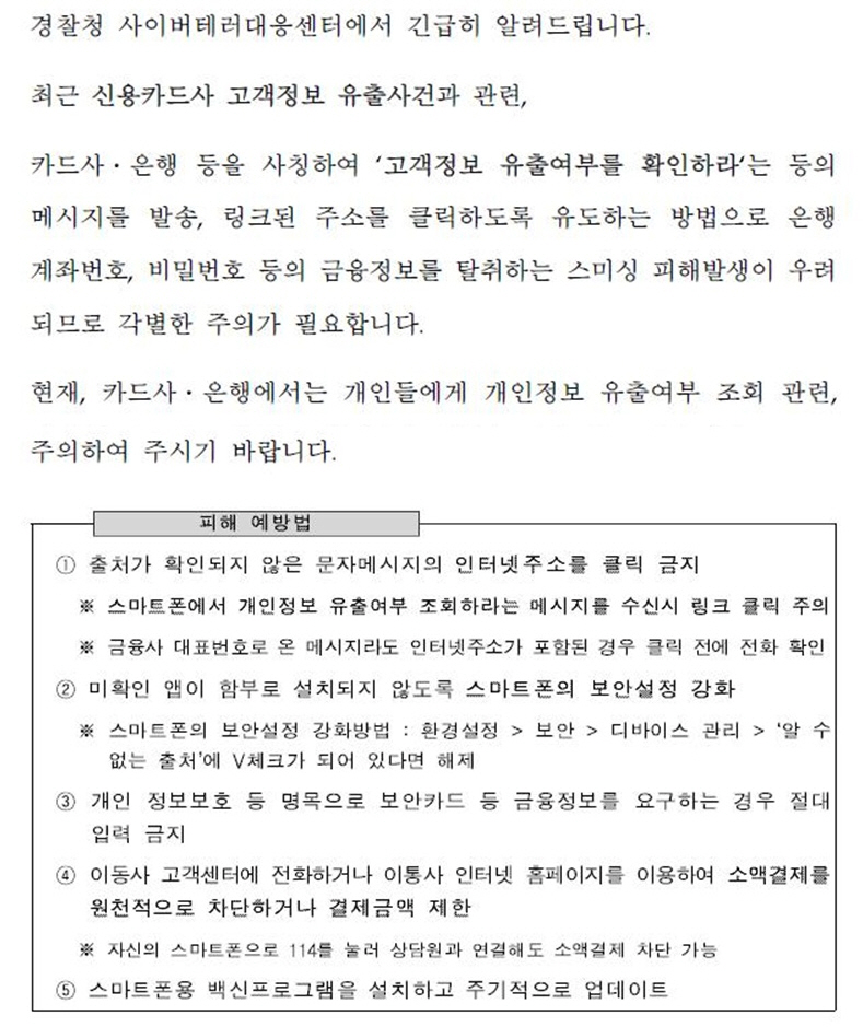 한편, 경찰청 사이버테러대응센터에 따르면 최근 카드사 고객 정보 유출과 관련해 금융기관을 사칭한 스미싱 문자 메시지가 급속도로 증가하고 있다고.