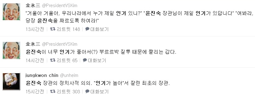 이밖에도 누리꾼들이 윤 장관의 인기 때문에 해임된 것 아니냐는 재미있는 반응을 보였다.
