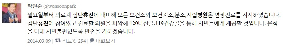 박 시장은 9일 트위터를 통해 이같이 언급하고는 “집단휴진에 참여 않고 진료할 의원을 파악해 120 다산콜, 119건강콜을 통해 시민들에게 제공할 것”이라고 밝혔다.